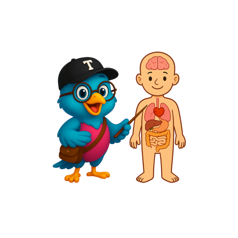 Mit bunten Bildern, anschaulichen Vergleichen („Das Herz ist wie eine Pumpe“, „Das Gehirn ist die Schaltzentrale“) und kleinen Mitmachübungen lässt er die Kinder aktiv erleben, was im Körper passiert. Er erklärt auf Augenhöhe, stellt Fragen, die zum Nachdenken anregen, und lädt die Kinder ein, selbst zu spüren – etwa ihren Herzschlag, die Atmung oder ihre Muskeln beim Bewegen.